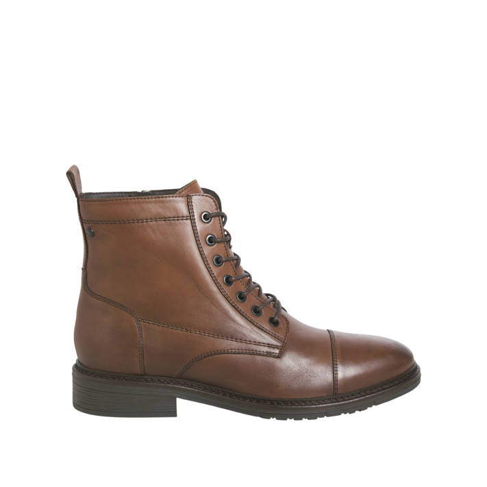Μαύρο ανδρικό δερμάτινο μποτάκι του brand JACK & JONES. Δένει με κορδόνια και φερμουάρ για πιο εύκολη και γρήγορη εφαρμογή.