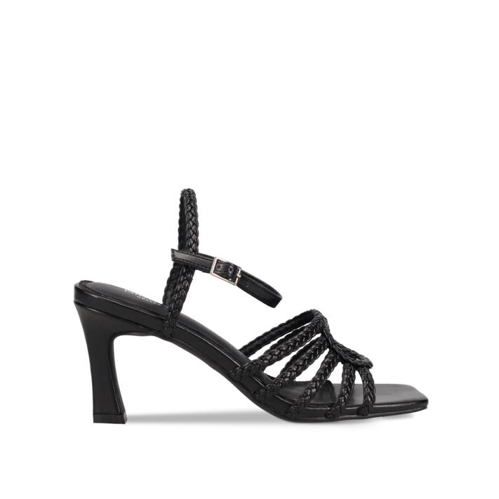Ασημί ψηλοτάκουνο πέδιλο με λεπτά πλεκτά λουράκια και τετράγωνο κόψιμο μπροστά. Δένει με ρυθμιζόμενο λουράκι αστραγάλου.