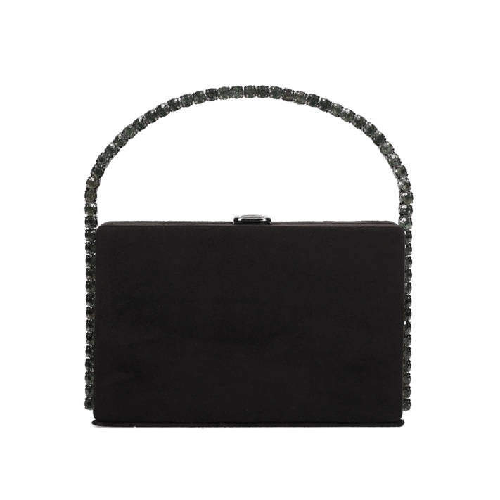 Animal print evening bag in suede texture. Features round handle with crystals. Fastens with clasp.