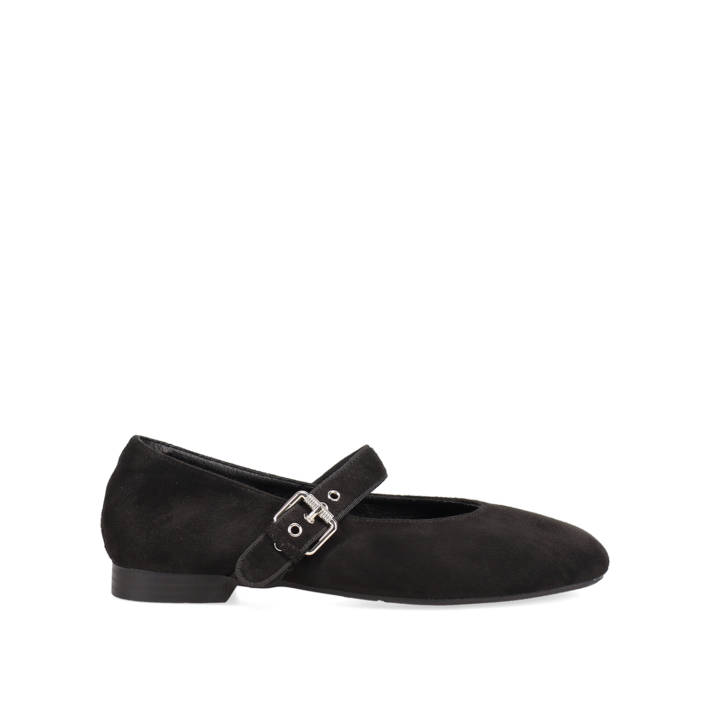 Brown ballet flat with suede texture. Features low square heel. Fastens with strap.