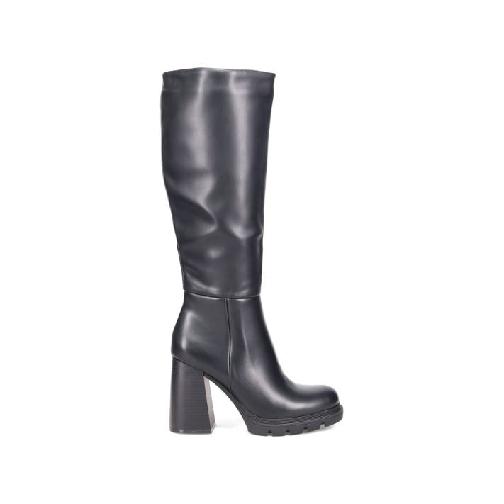 Brown boot with high block heel. Fastens with zipper.