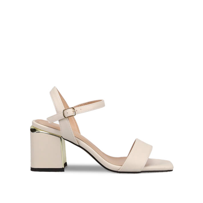Pink sandal with band. Features high block heel and gold detail at the back part. Fastens with adjustable ankle strap.