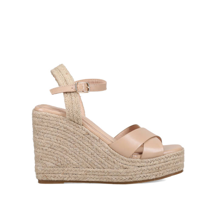 Black cross-strap sandal. Features a high rope-covered wedge. Fastens with an adjustable ankle strap.