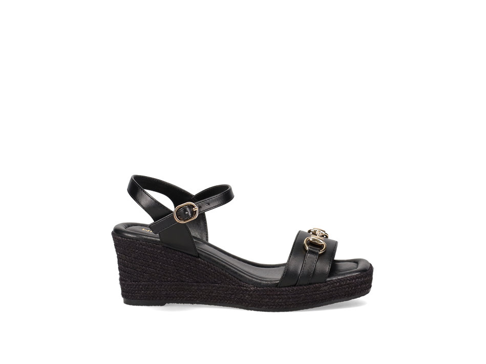 Tan platform wedge sandal with band. Fastens with adjustable ankle strap with buckle.