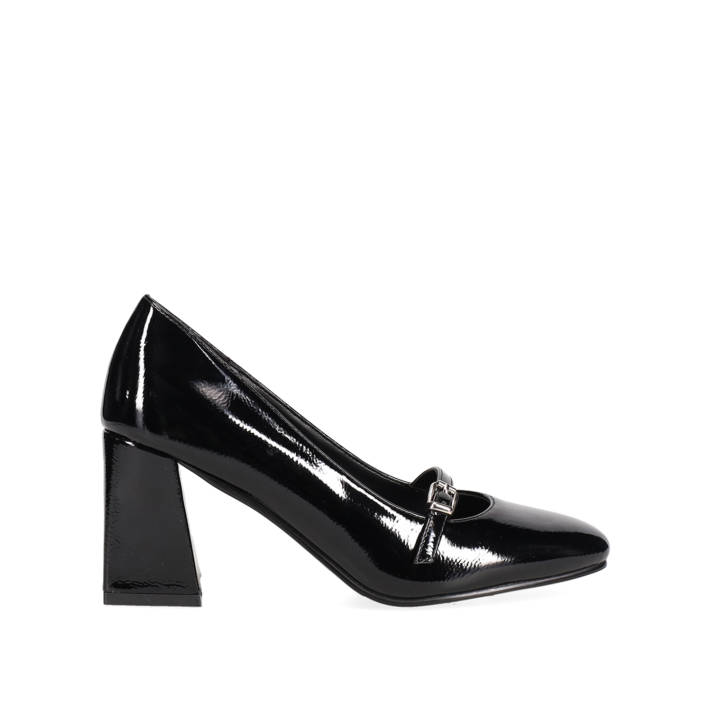 Burgundy patent pump. Features adjustable strap and high block heel.