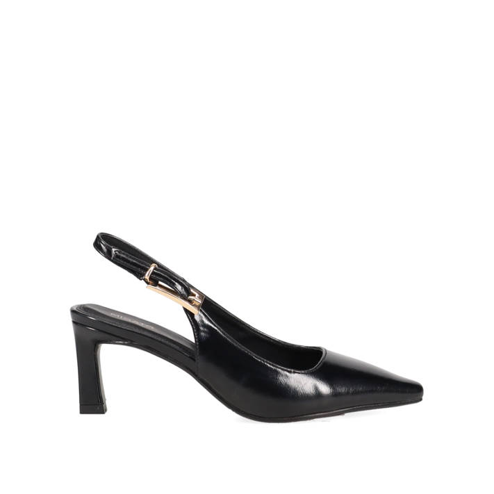 Burgundy slingback pump. Features pointy toe and medium heel. Fastens with adjustable slingback strap.