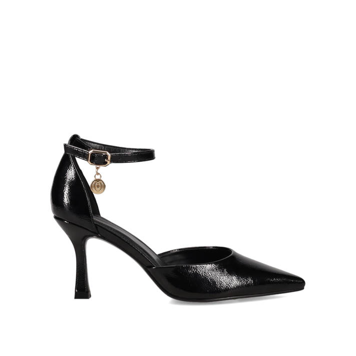 Red pump. Features pointy toe and high heel. Fastens with adjustable ankle strap.