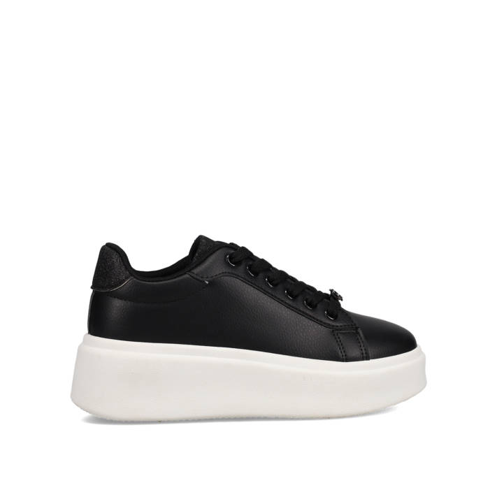 White women''s sneaker. Features a white flatform sole. Fastens with laces.